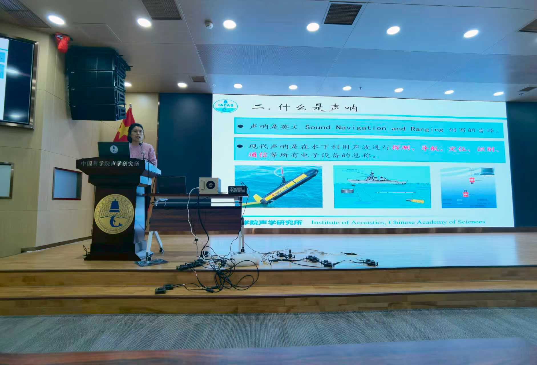 首先,水下信息技术实验室副研究员吴长瑞带来了题为《探海利器声呐及其应用》的报告。吴老师生动讲解了声波作为水下“眼睛”和“耳朵”的独特优势,系统介绍了声呐技术的基本原理、发展历程及其在海洋探测、资源开发、安全等领域的广泛应用。从“蛟龙号”的深潜通信到海洋地质勘探,吴老师用丰富的案例,为教师们揭开了水声世界的神秘面纱。